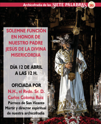 Concluida la Semana Santa y con el gozo de la resurrección del Señor, nuestra archicofradía celebrará el próximo domingo 12 de abril, Dios mediante, la solemne función en honor de Nuestro Padre Jesús de la Divina Misericordia, que será oficiada por nuestro hermano, el Rvdo. Sr. D. Carlos Coloma Ruiz,...