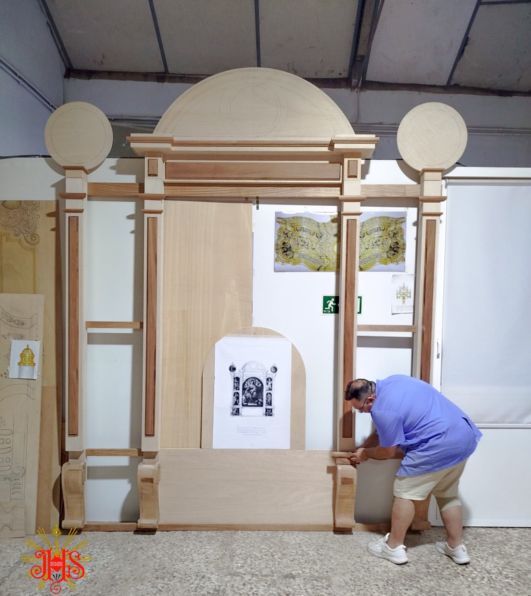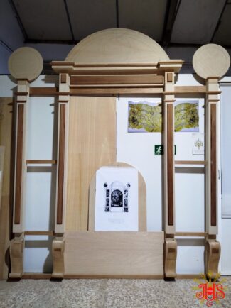 El retablo se encuentra en su fase final de carpintería, donde ya se han definido los elementos principales. Una vez finalizada esta etapa, se procederá con el estucado y el Dorado, que serán la fase final del retablo.