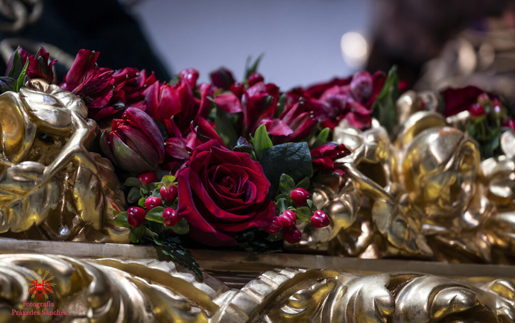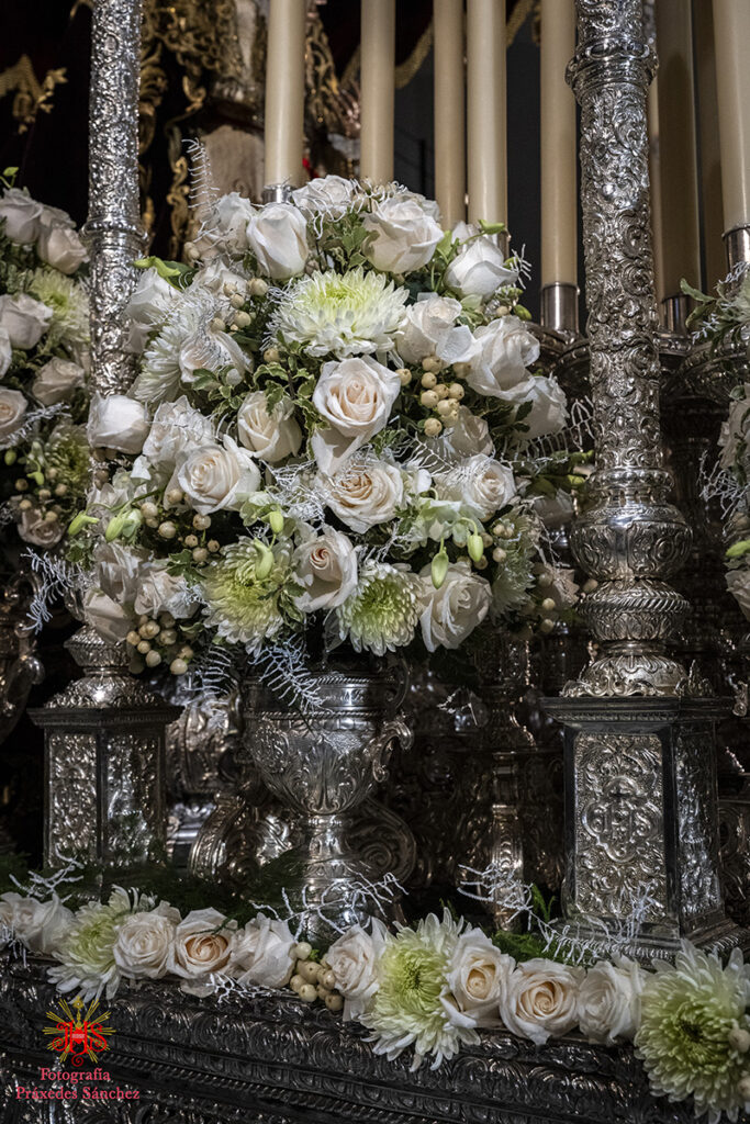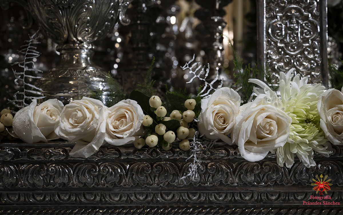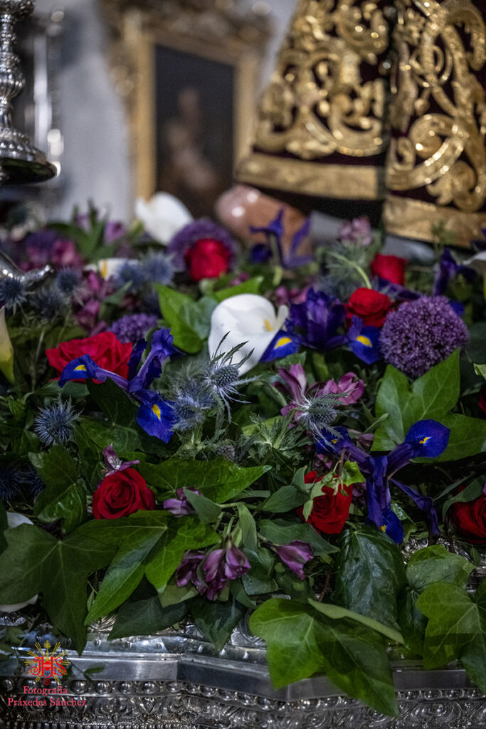 En lo que respecta a nuestros sagrados titulares, el paso de Nuestro Padre Jesús de la Divina Misericordia estaba exornado por allium morados, rosas rojas, eryngium, alstroemerias moradas, calas blancas, hiedra y helecho coral, mientras que en el paso del Santísimo Cristo de las Siete Palabras y María Santísima de los Remedios el exorno floral se componía de rosas rojas, tulipanes rojos, alstroemerias rojas, tallos de hypericum rojos, pittosporum y helechos y por último el palio de Nuestra Señora de la Cabeza contaba con flores rosas champán, dendromios, hypericum, crisantemos blanco, pittosporum y helecho real blanco.
