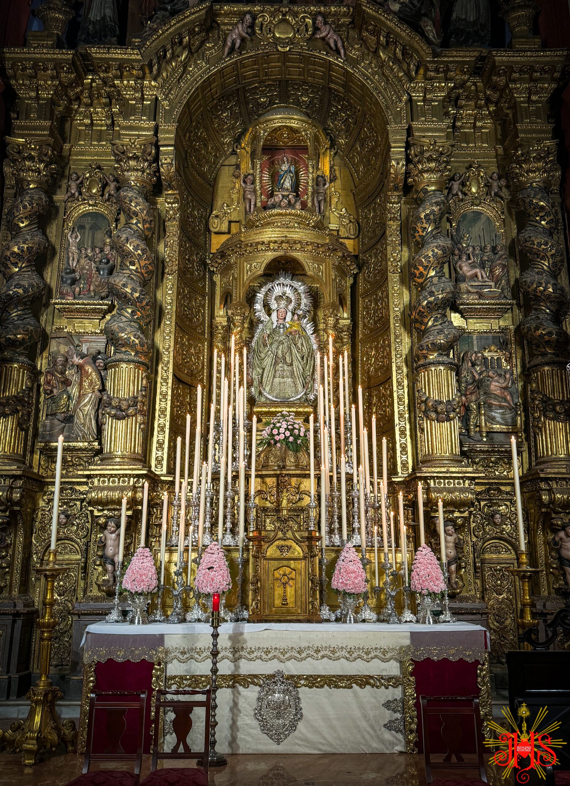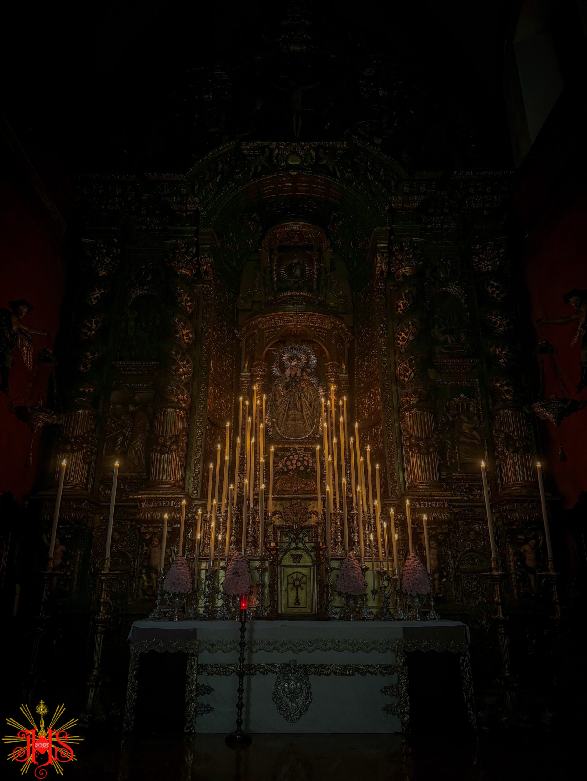 Para ello, el equipo de priostía dispuso a la imagen en la hornacina del altar mayor, alrededor del cual se situaba una abundante candelería. El exorno floral estuvo compuesto por cuatro jarras de claveles rosas. Por otra parte, la Virgen fue ataviada por Joaquín Gómez con un conjunto verde brocado en plata y encajes de hilos de plata y parte de las joyas que conforman su ajuar, destacando sus pendientes de plata y pedrería.