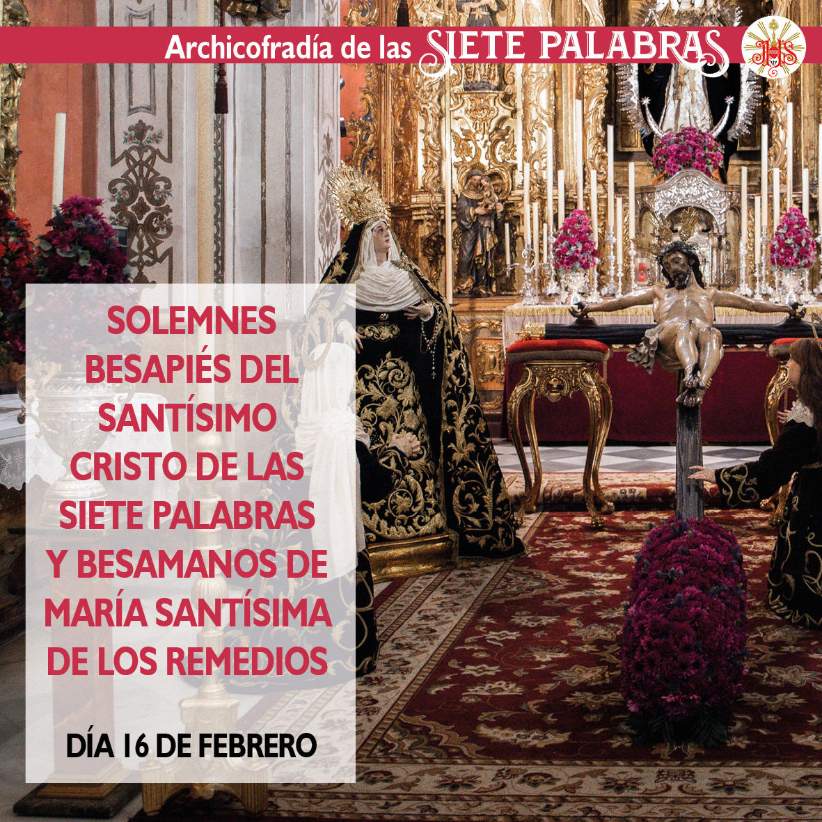 · 16 de febrero: Solemne besapiés del Santísimo Cristo de las Siete Palabras y besamanos de María Santísima de los Remedios en horario de 10.30-14.00 horas y de 17.30-21.00 horas, a excepción de las misas parroquiales de 12.00 horas y 20.00 horas.
