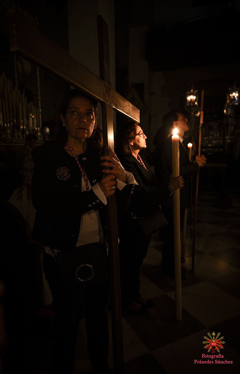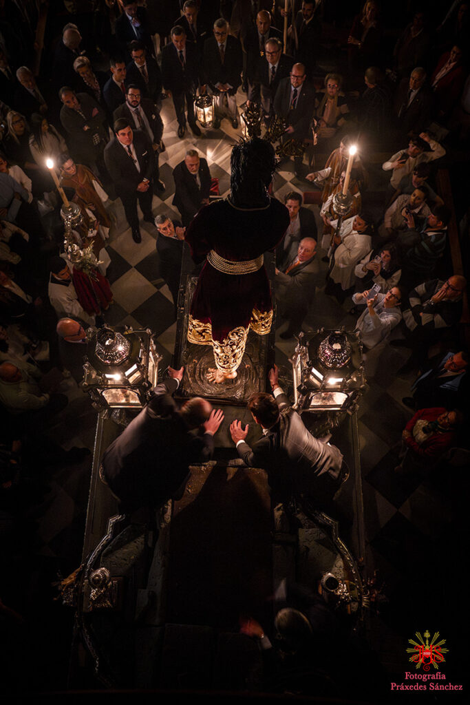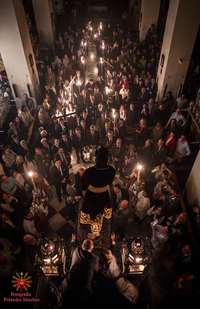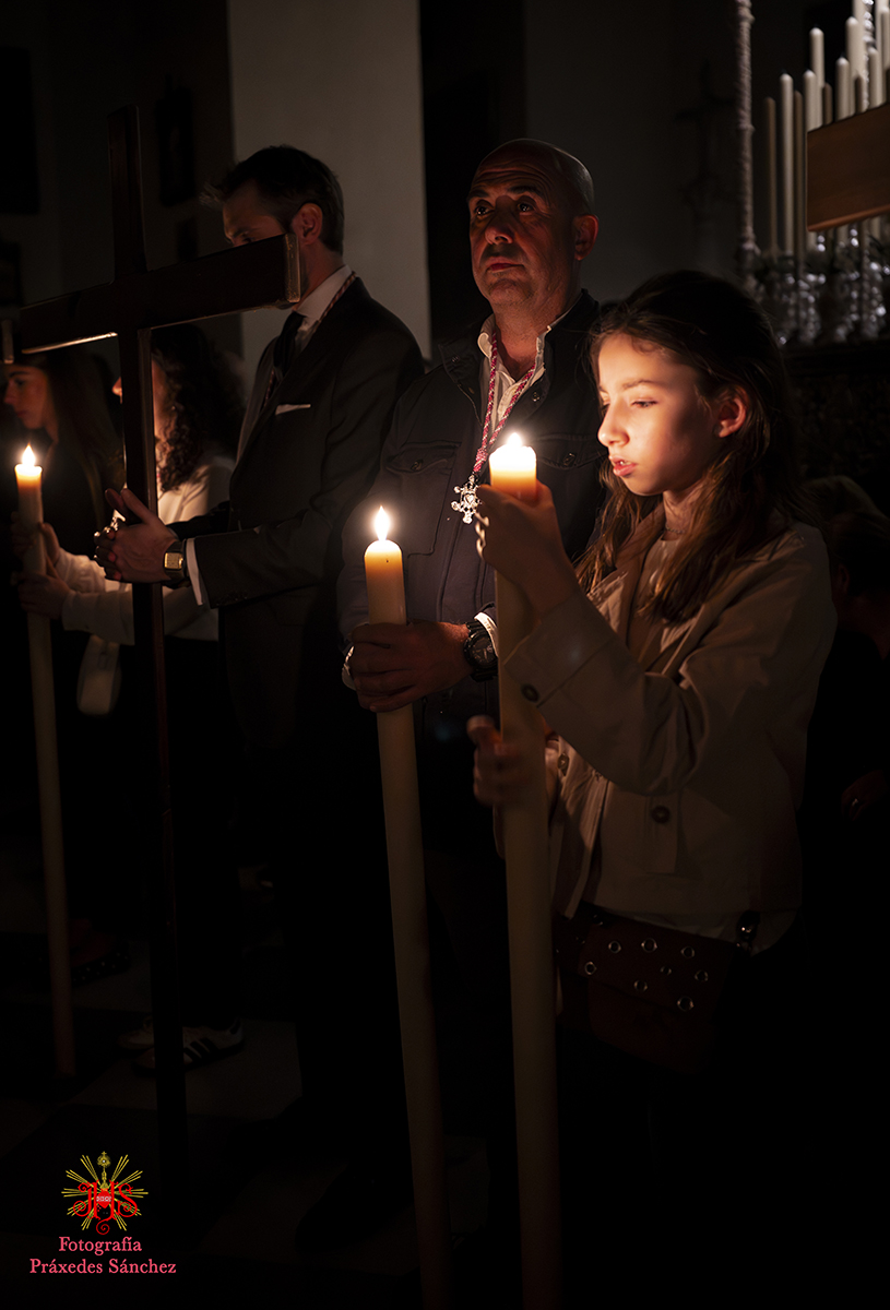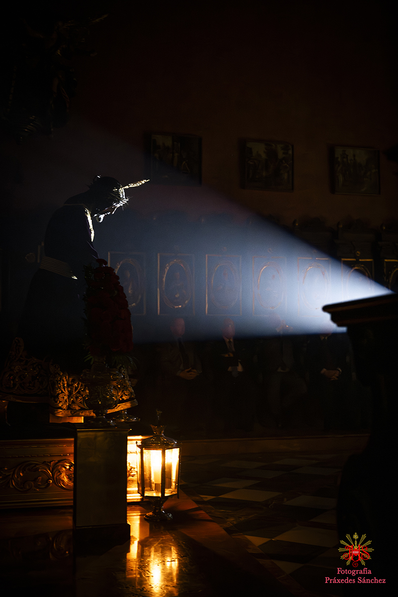 Ya en las vísperas de la Semana Santa, se celebró el solemne besamanos en honor del Señor, el cual se dispuso en la capilla del Sagrario, presidiendo un altar de más de 30 cirios que culminaba con nuestra cruz de guía y contando con dos jarras a sus laterales con claveles rojos. A lo largo de la mañana y la tarde fueron muchos los devotos que se acercaron a disfrutar de la cercanía del Señor hasta pasada la misa parroquial de la tarde, momento en el que nuestro templo quedó en penumbra, salvo por la luz de los cirios que portan los hermanos, para dar paso al rezo del Vía Crucis presidido por Nuestro Padre Jesús de la Divina Misericordia y a su posterior subida al paso, hito de recogimiento en el que se suceden diferentes saetas.