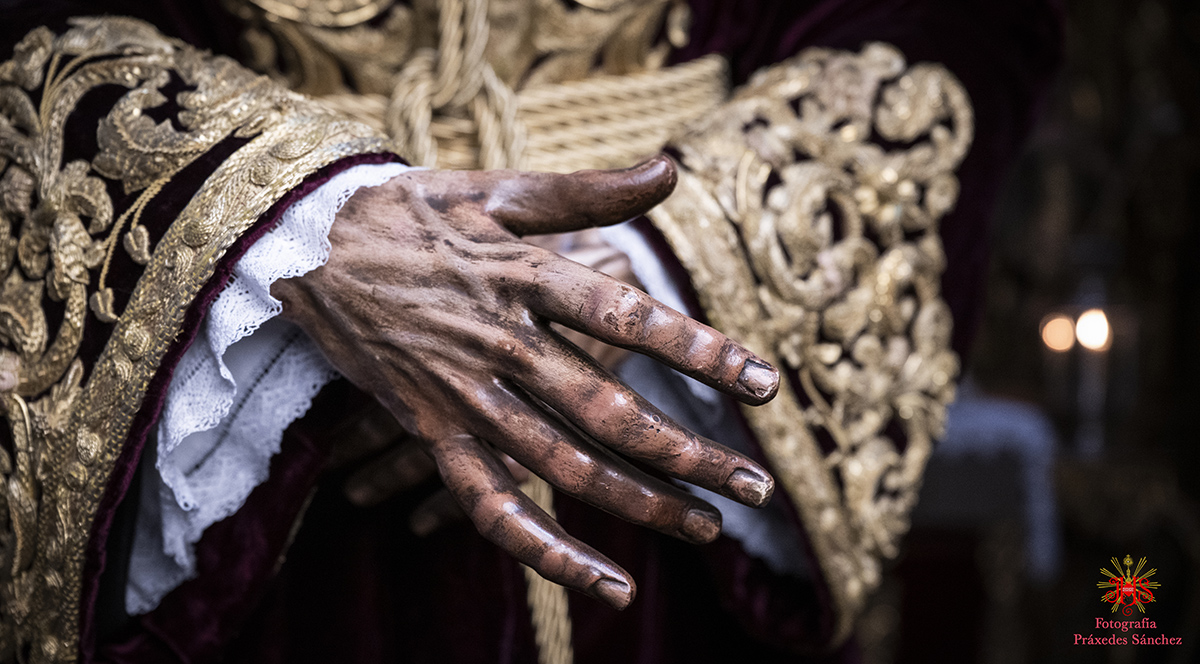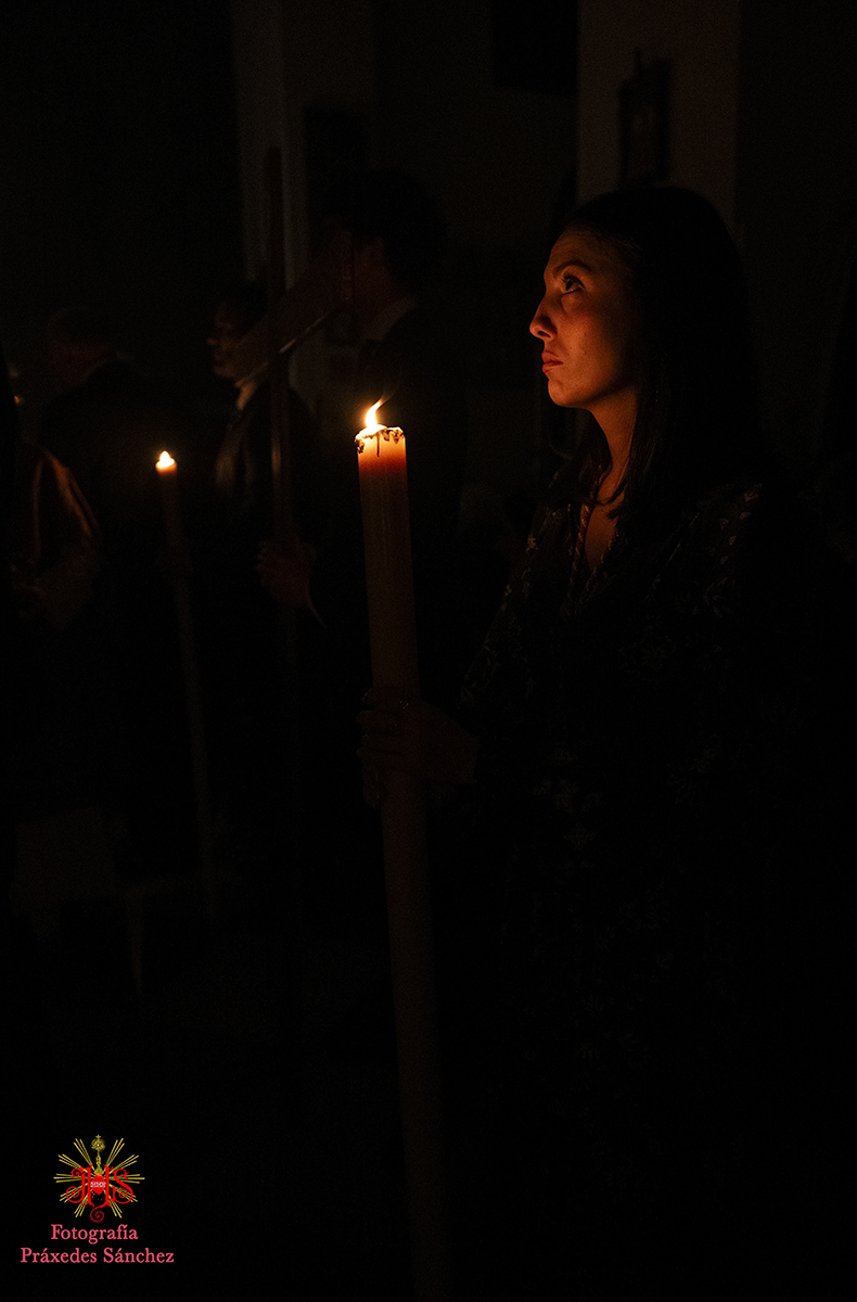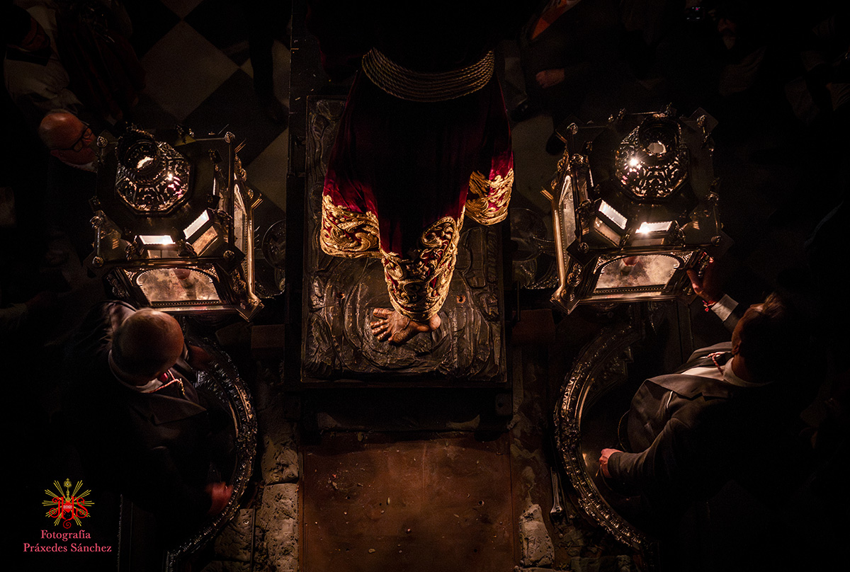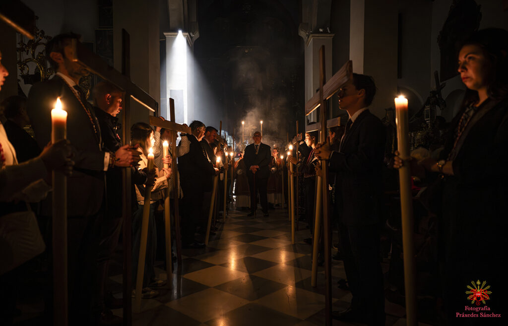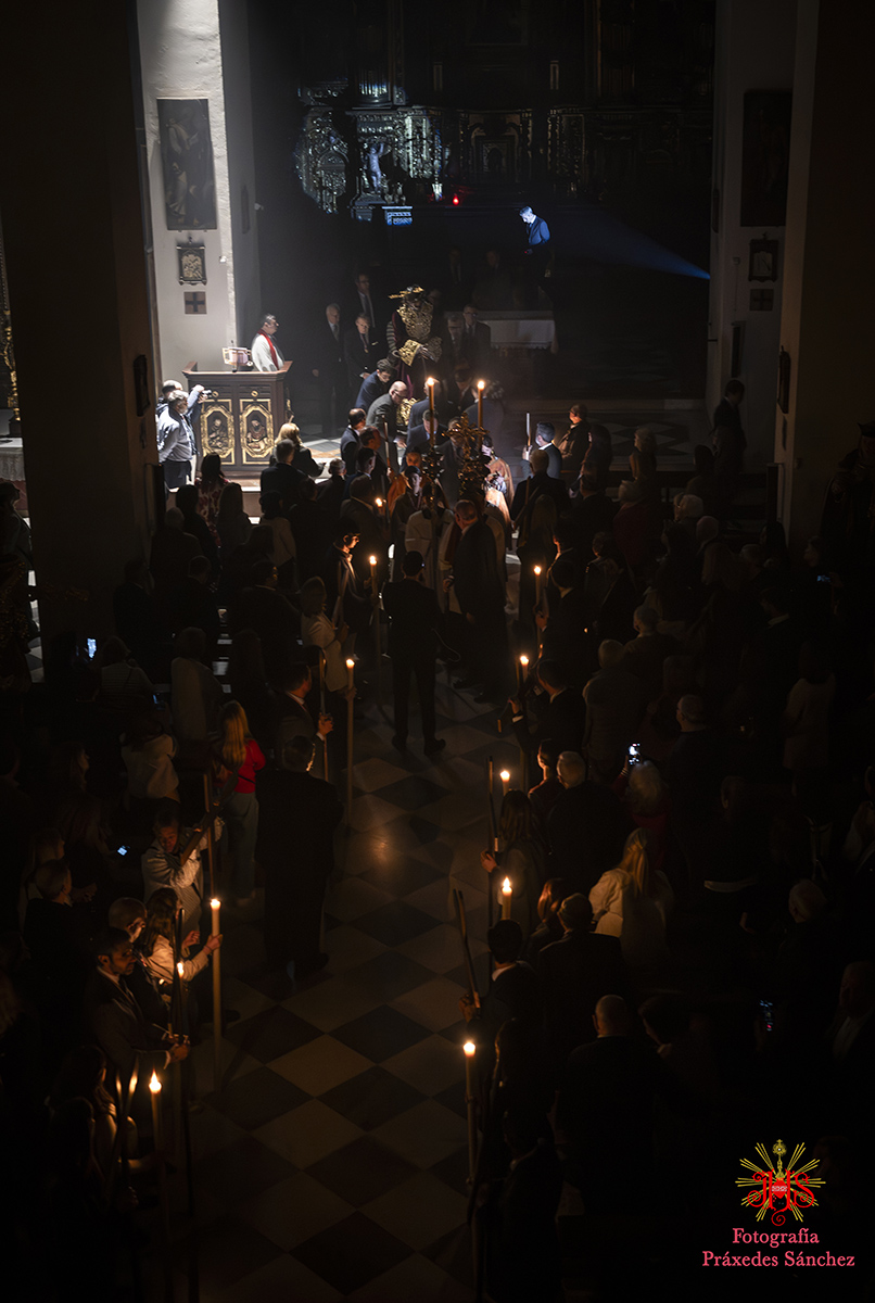 Ya en las vísperas de la Semana Santa, se celebró el solemne besamanos en honor del Señor, el cual se dispuso en la capilla del Sagrario, presidiendo un altar de más de 30 cirios que culminaba con nuestra cruz de guía y contando con dos jarras a sus laterales con claveles rojos. A lo largo de la mañana y la tarde fueron muchos los devotos que se acercaron a disfrutar de la cercanía del Señor hasta pasada la misa parroquial de la tarde, momento en el que nuestro templo quedó en penumbra, salvo por la luz de los cirios que portan los hermanos, para dar paso al rezo del Vía Crucis presidido por Nuestro Padre Jesús de la Divina Misericordia y a su posterior subida al paso, hito de recogimiento en el que se suceden diferentes saetas.