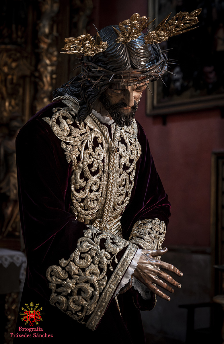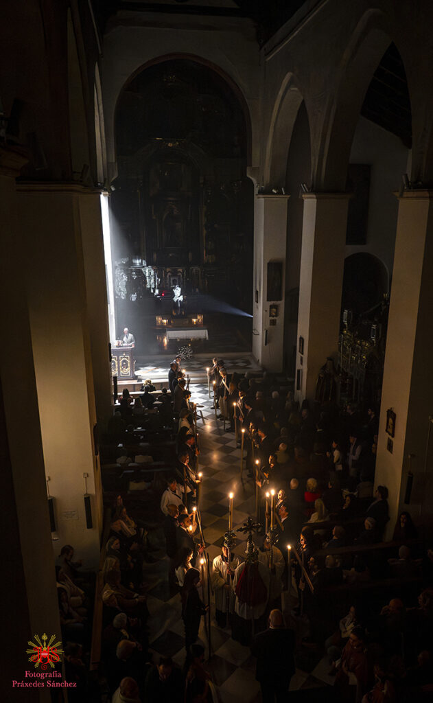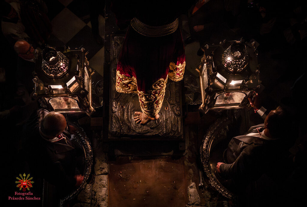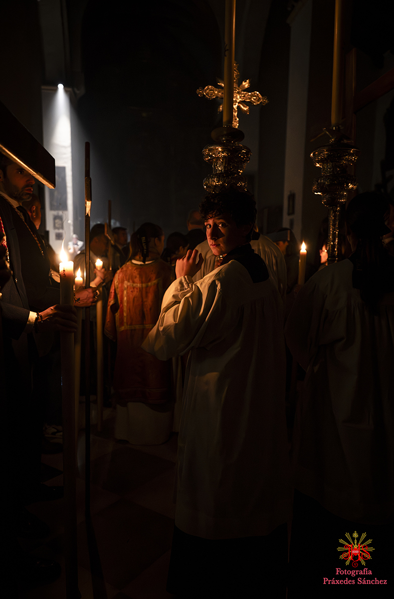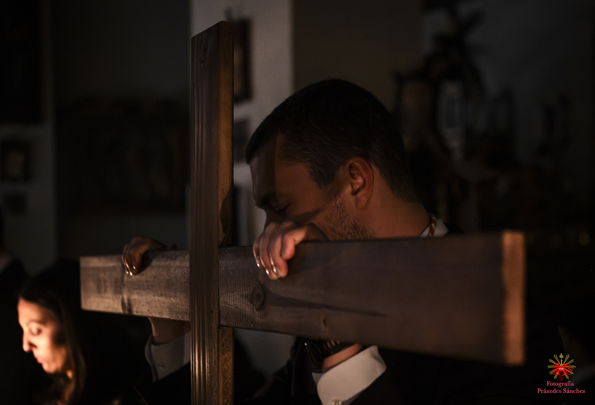 Ya en las vísperas de la Semana Santa, se celebró el solemne besamanos en honor del Señor, el cual se dispuso en la capilla del Sagrario, presidiendo un altar de más de 30 cirios que culminaba con nuestra cruz de guía y contando con dos jarras a sus laterales con claveles rojos. A lo largo de la mañana y la tarde fueron muchos los devotos que se acercaron a disfrutar de la cercanía del Señor hasta pasada la misa parroquial de la tarde, momento en el que nuestro templo quedó en penumbra, salvo por la luz de los cirios que portan los hermanos, para dar paso al rezo del Vía Crucis presidido por Nuestro Padre Jesús de la Divina Misericordia y a su posterior subida al paso, hito de recogimiento en el que se suceden diferentes saetas.