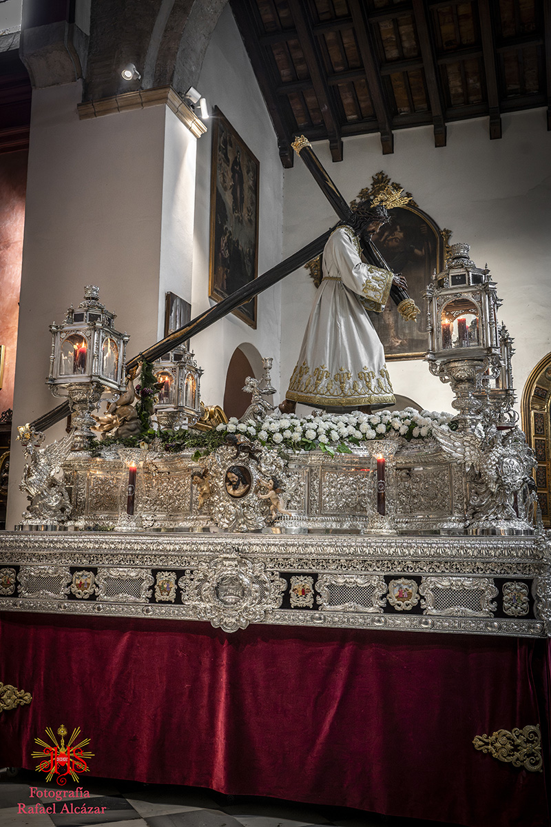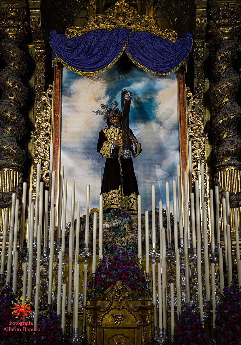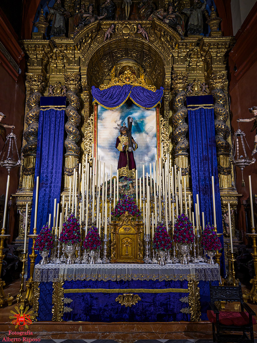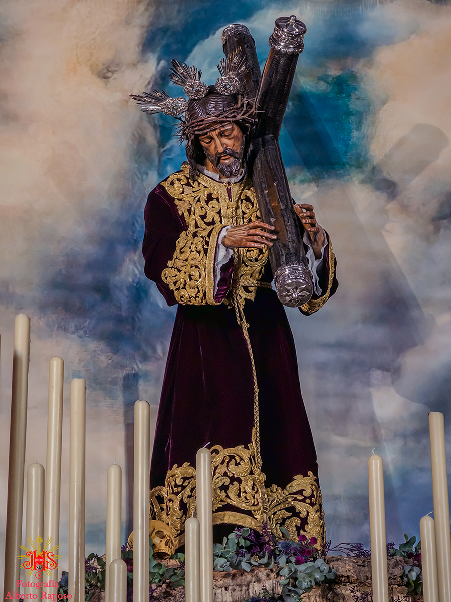 Respecto del altar que presidió la sagrada imagen, nuestra priostía dedicó este año su trabajo a presentarnos a la sagrada imagen en su camino hacia el monte Calvario, empleando un dosel compuesto con un cortinaje morado, símbolo de la penitencia, que se abría y mostraba la calle de la Amargura, a través de un fondo pictórico y un camino agreste y seco salpicado de cardos y helechos como muestra del martirio de Jesús, portando el Señor los atributos pasionistas. Para la ocasión el altar estaba completado por un exorno de flores compuesto por alhelíes, claveles, erigium, limonium y crisantemos.
