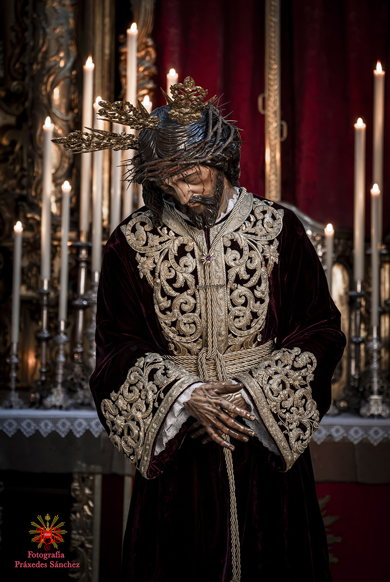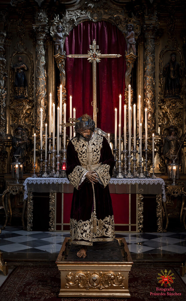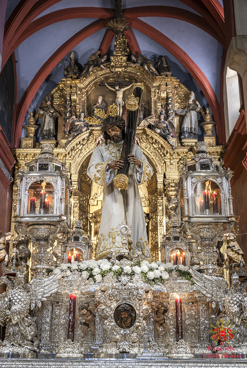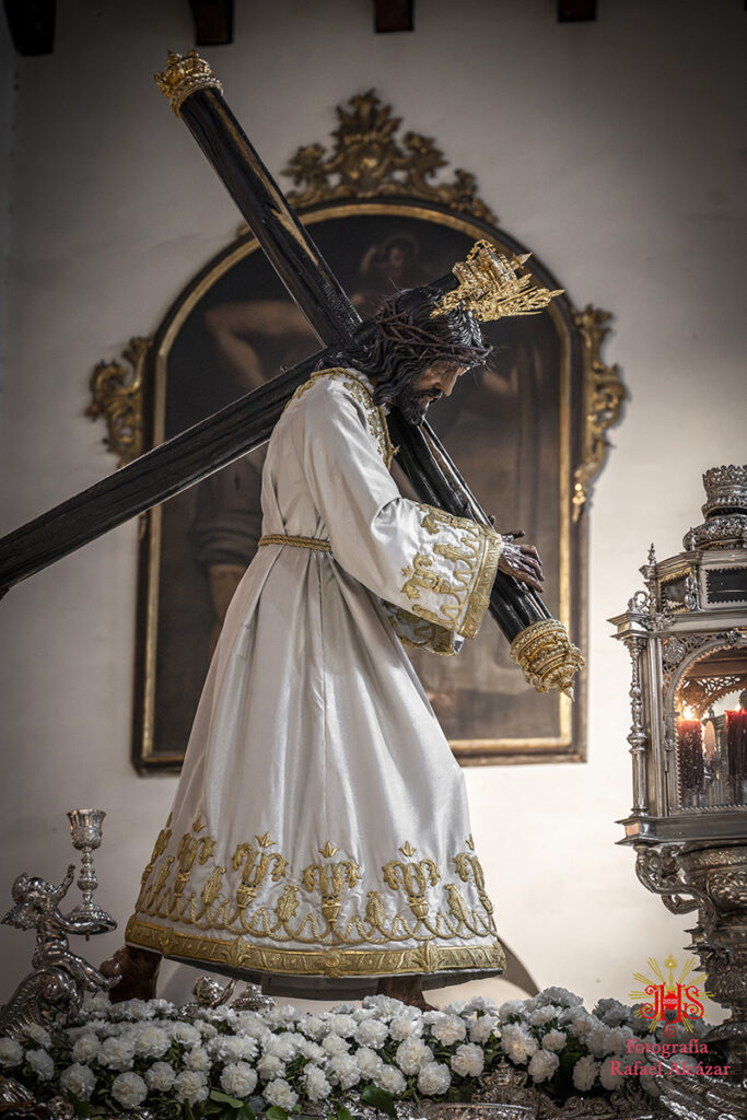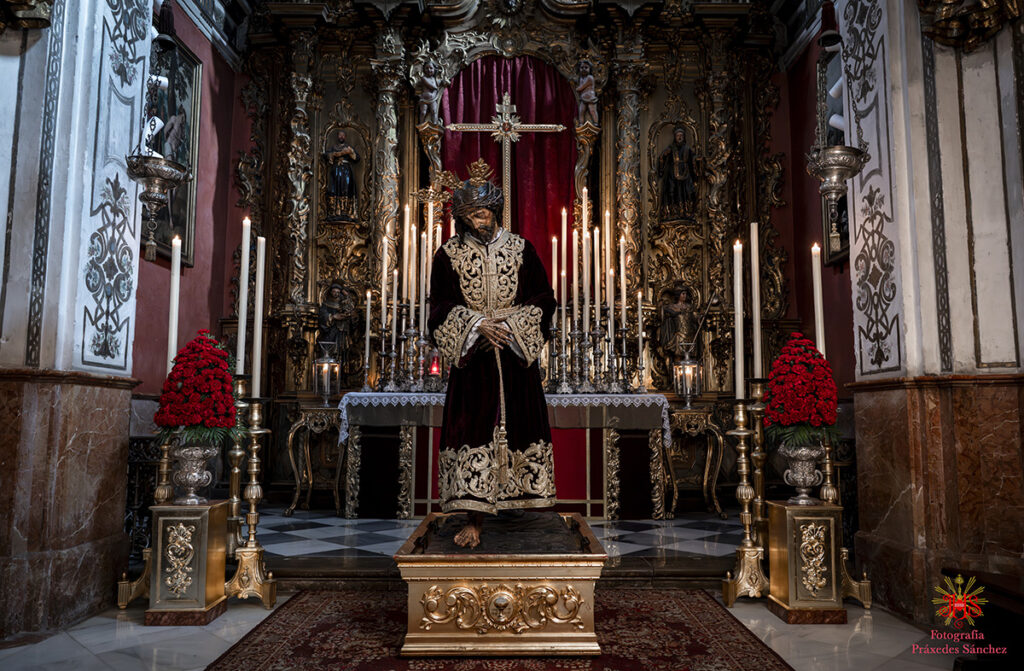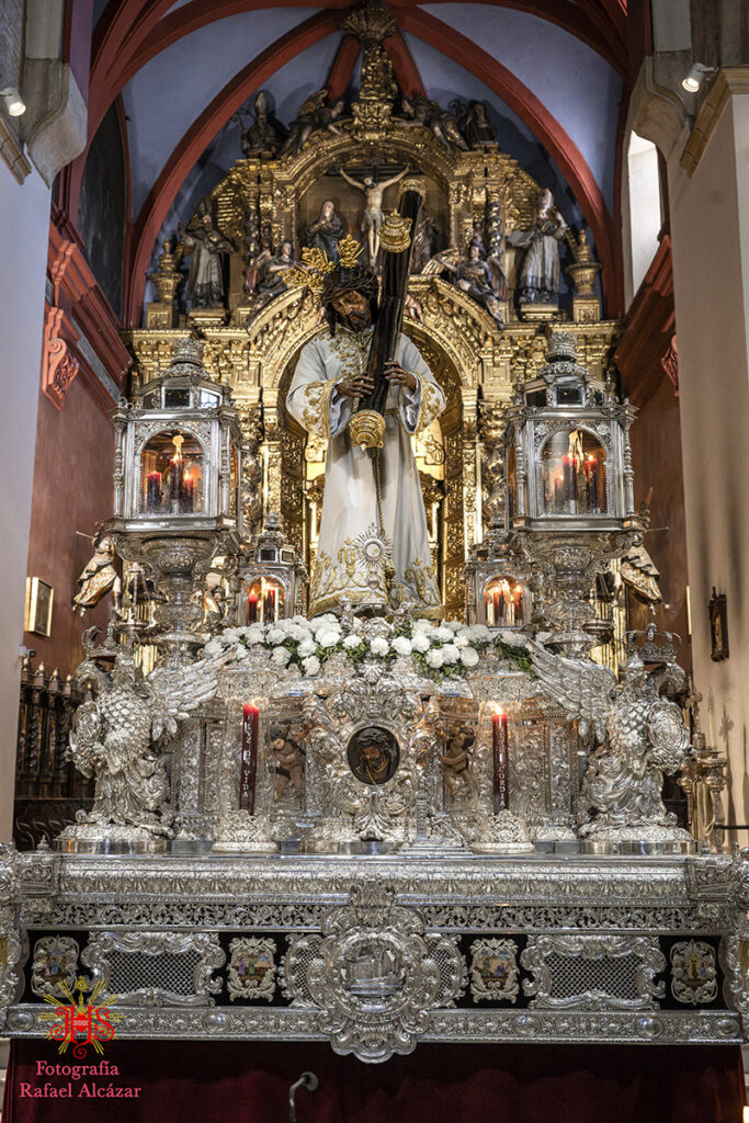 Respecto del altar que presidió la sagrada imagen, nuestra priostía dedicó este año su trabajo a presentarnos a la sagrada imagen en su camino hacia el monte Calvario, empleando un dosel compuesto con un cortinaje morado, símbolo de la penitencia, que se abría y mostraba la calle de la Amargura, a través de un fondo pictórico y un camino agreste y seco salpicado de cardos y helechos como muestra del martirio de Jesús, portando el Señor los atributos pasionistas. Para la ocasión el altar estaba completado por un exorno de flores compuesto por alhelíes, claveles, erigium, limonium y crisantemos.