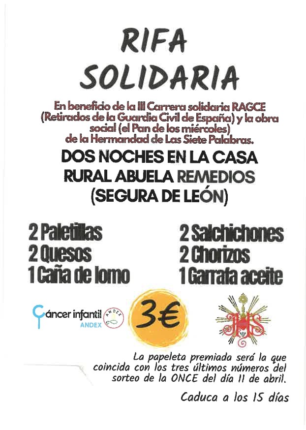 Asimismo, RAGCE colaborará con nuestra archicofradía a través de una rifa solidaria cuyo destino será nuestra obra social de “El pan de los miércoles”, mediante la venta de papeletas por el precio de 3 euros, que se pueden adquirir tanto en la oficina de la asociación de veteranos de la Guardia Civil, de lunes a viernes, y en casa hermandad. El sorteo se celebrará el próximo día 11 de abril, dando como premio del mismo:
