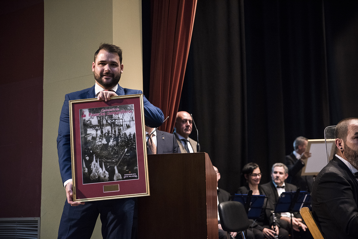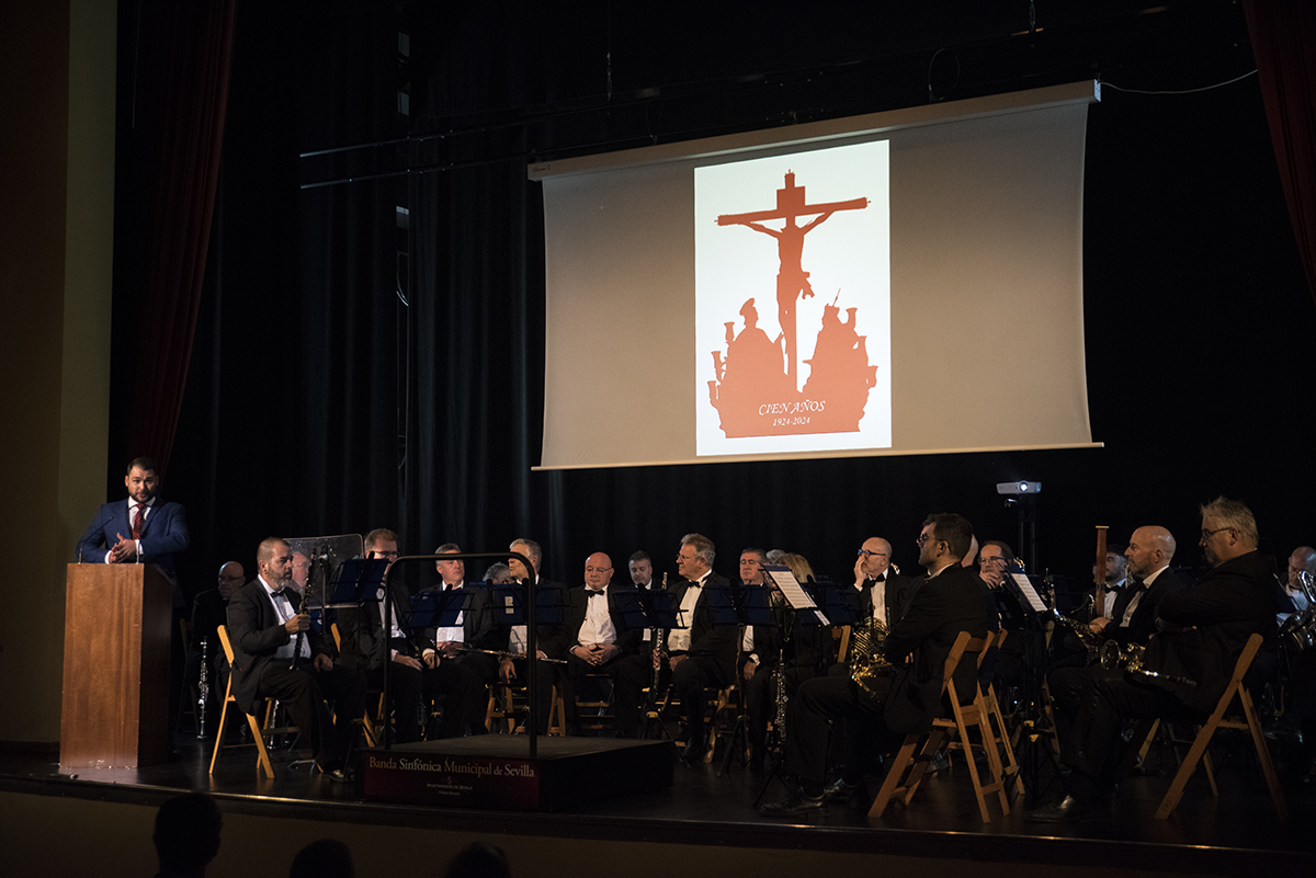Pasadas las 20.00 horas de la tarde, daba comienzo el acto en un abarrotado Teatro Hogar de la Virgen de los Reyes, el cual, estuvo presentado por nuestro hermano Javier Blanco. En él pudimos asistir a la presentación tanto del logo como del cartel conmemorativo de la efeméride, elaborados por el equipo de comunicación de la hermandad. El logotipo muestra la silueta en color carmesí del paso de misterio de las Siete Palabras con una visión trasera, dado que es como lo vería Farfán cuando interpretó la marcha tras él, mientras que el cartel lo protagoniza una fotografía de 1924, año del estreno de la marcha, del paso por la calle Alfonso XII, tras el que se ve la banda del Regimiento de Soria número 9.