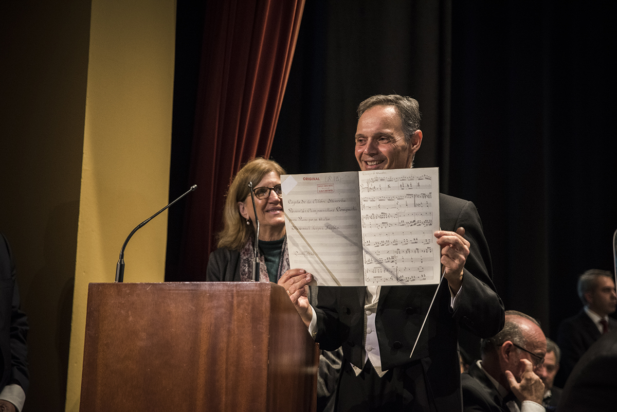 A continuación, el Ayuntamiento de Sevilla nos hizo entrega, de manos de su concejala Amidea Navarro, de un facsímil de la partitura original de “Pasan los Campanilleros”, cuyo original conserva la casa consistorial. Le agradecemos enormemente este regalo que viene a enriquecer el archivo de la archicofradía.