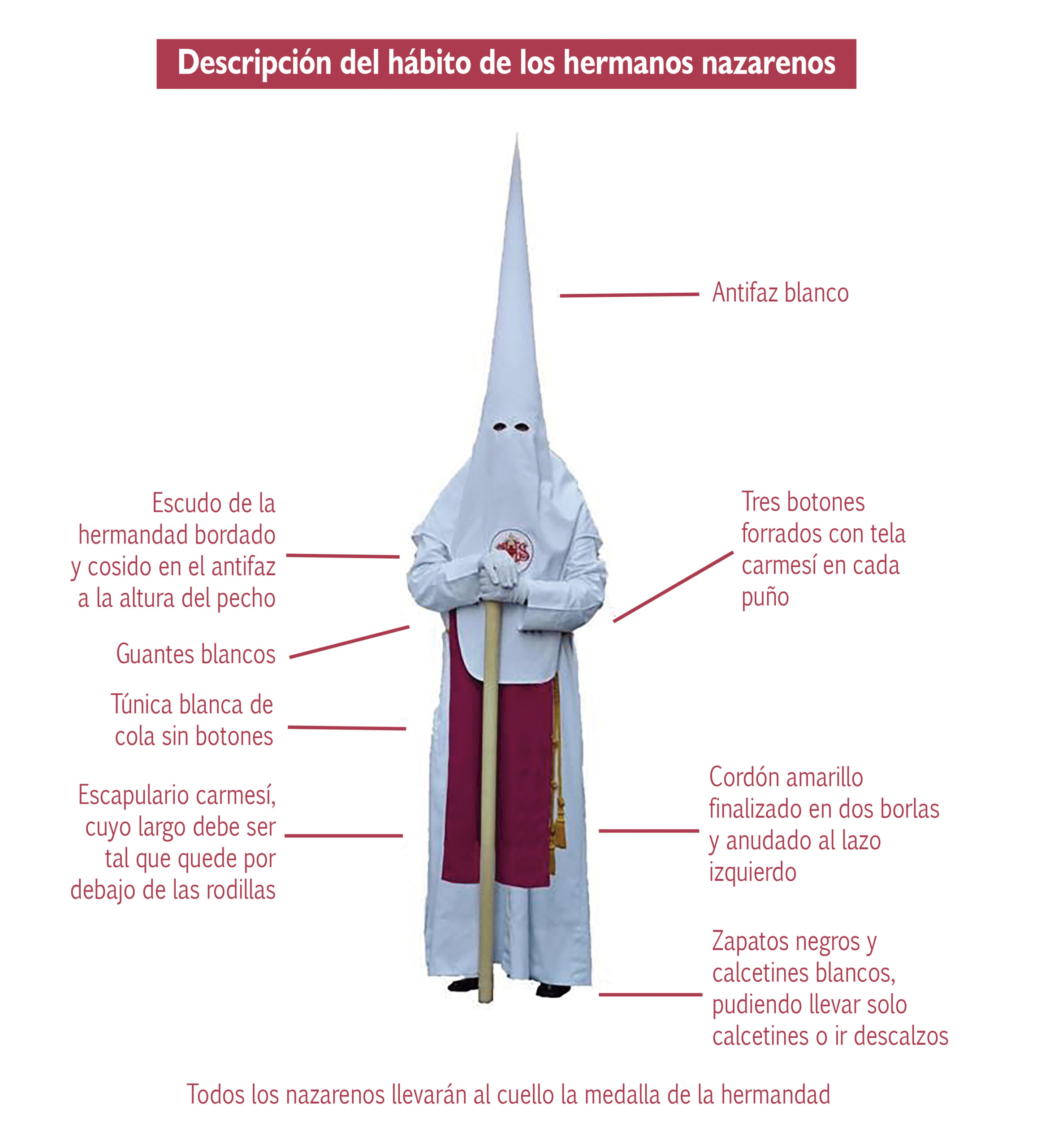 1-. El hábito de nazareno estará compuesto por túnica de cola de color blanco, antifaz del mismo color con el escudo de la hermandad; las bocamangas de la túnica llevarán tres botones de color carmesí; escapulario carmesí; guantes de color blanco; cíngulo amarillo ceñido al lado izquierdo y finalizado en dos borlas; calzado negro y calcetín blanco, estando prohibidas las sandalias, zapatillas de deporte o similar. Deberán además portar al cuello la medalla oficial de nuestra archicofradía.