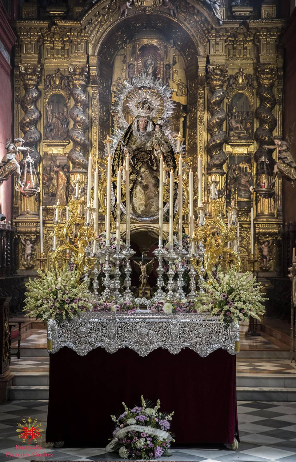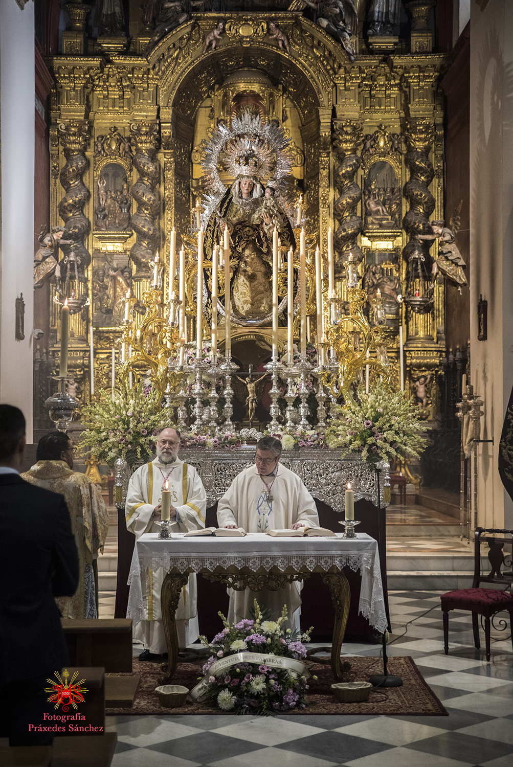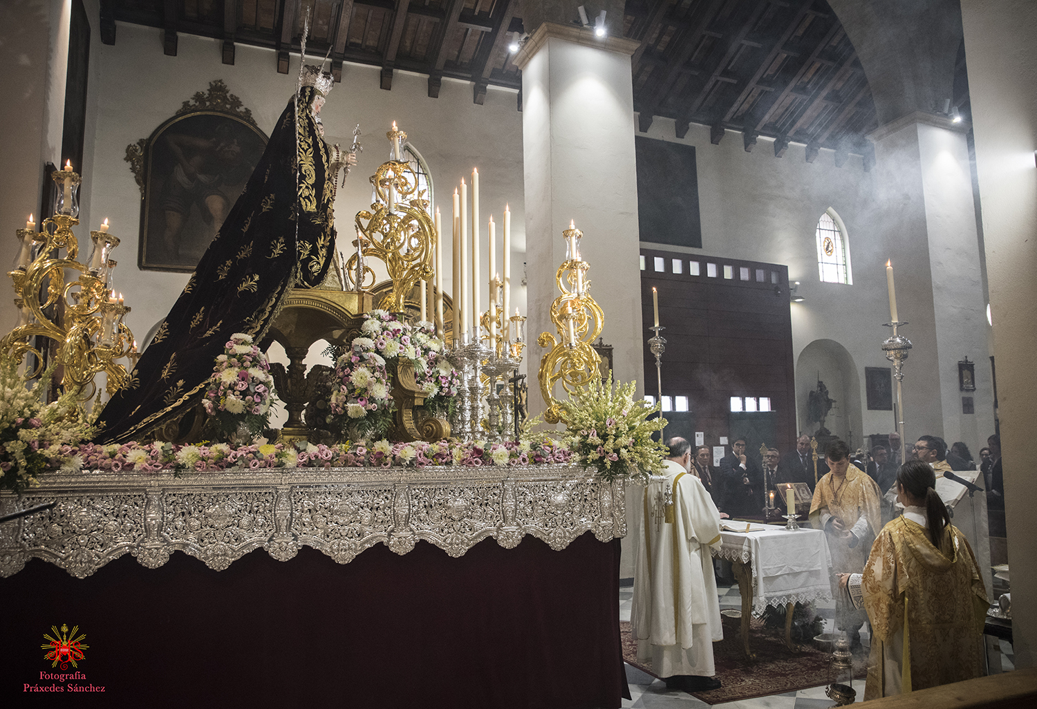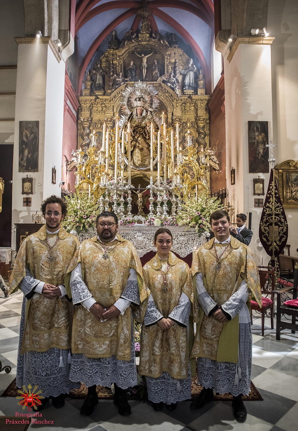 Comenzó noviembre y con la festividad de Todos los Santos, pudimos contemplar como se erigía en su paso Nuestra Señora del Rosario. Minutos antes de las 12.00 y previo al comienzo de la solemne función, todos nuestros hermanos se congregaban alrededor de la plaza de Doña Teresa Enríquez expectantes para escuchar el estreno por parte de la Banda de Cornetas y Tambores “Esencia” de los ministriles del Santo Rosario, obras compuestas por don José Manuel Ortega León, al cual agradecemos su aportación para seguir incrementando nuestro patrimonio musical. Pasado el mediodía, dio comienzo la solemne función, predicada por nuestro hermano y director espiritual, don Carlos Coloma Ruiz, acompañado por nuestro diácono permanente y hermano, don Alberto Álvarez, y del cuerpo de acólitos, que dotaron de solemnidad a este acto con el cual recordamos y damos gracias a la Santísima Virgen por su protección y que no se produjeran desperfectos en nuestra parroquia y feligresía por el terremoto de Lisboa en el año 1755. Nuestros hermanos y devotos llenaron la Parroquia de San Vicente mártir para la ocasión y tuvimos el honor de que nos acompañaran representaciones de las hermandades de los Humeros, las Penas, Mercedes de la Puerta Real y Nuestra Señora de la Cabeza. También estuvieron presentes representantes del Consejo General de Hermandades y Cofradías y del Distrito Centro.