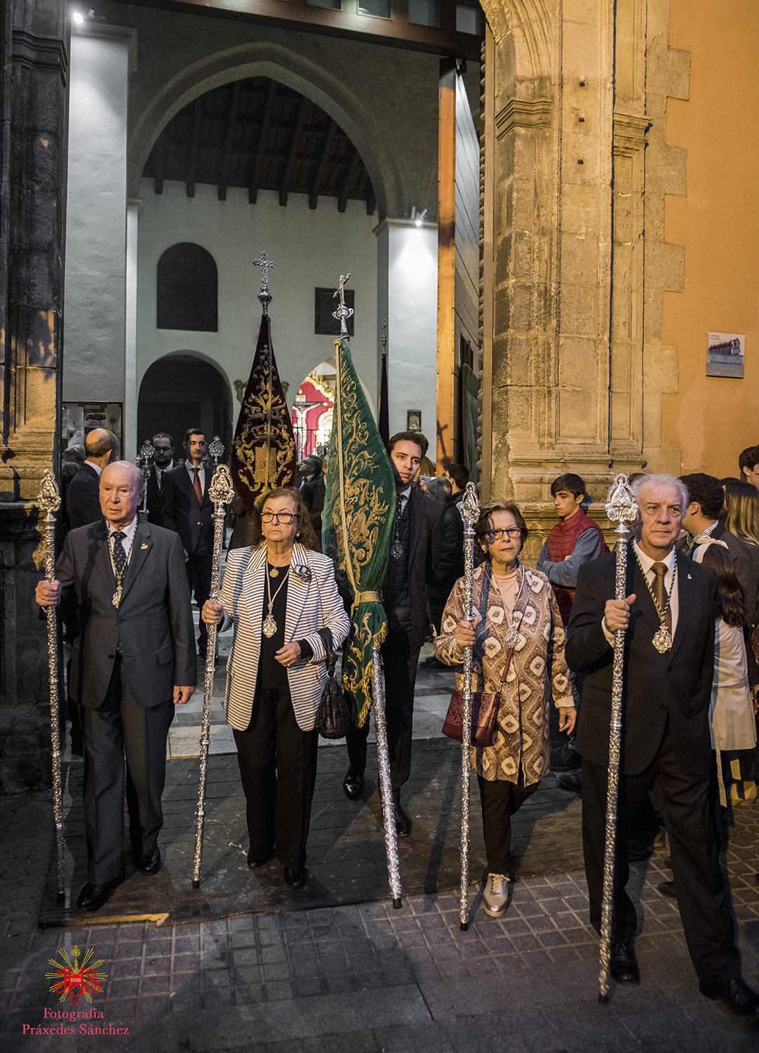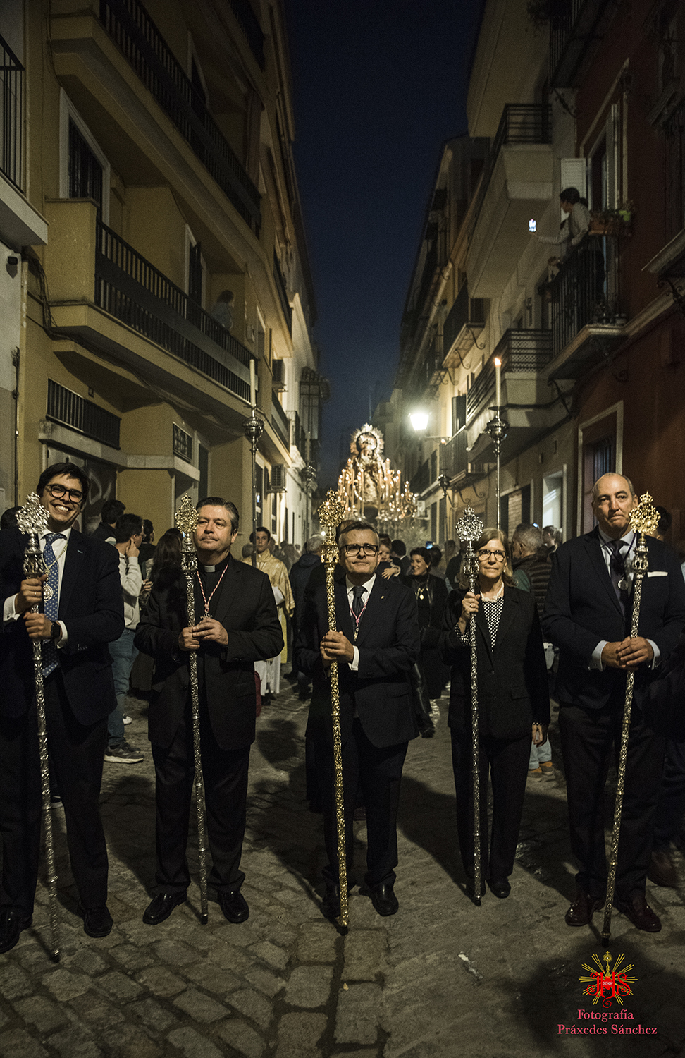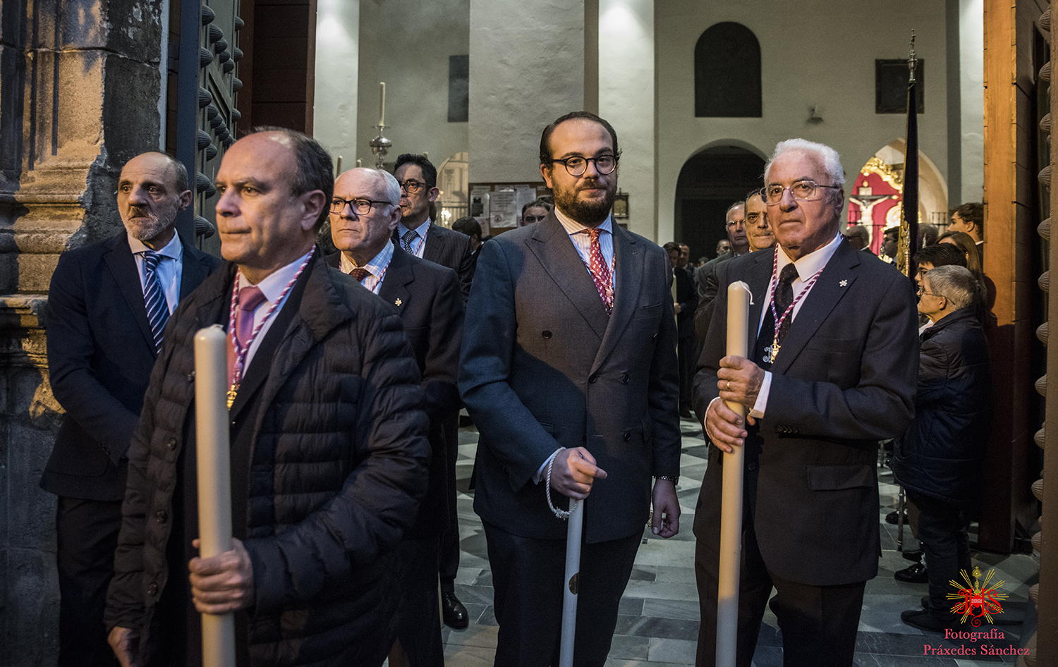 Sobre las 18.00 se abría la puerta de acceso a la parroquia para los hermanos que portaban cirios e ir conformando los dos tramos previstos, situándose a la entrada un cepillo para todos aquellos que quisieran colaborar con la bolsa de caridad de la hermandad y continuar nuestros proyectos dirigidos a mejorar la vida de aquellos quienes más lo necesitan. A las 18.30, precedido por los sones clásicos de las cornetas y tambores de nuestra querida banda Esencia, comenzó a salir el cortejo con cruz alzada y dos ciriales, continuado por más de treinta parejas de cirio, formando parte de él una representación de la querida Hermandad de Nuestra Señora de la Cabeza de San Juan de la Palma y en la presidencia tuvimos el placer de contar con la Hermandad de las Penas, así como del señor delegado de glorias del Consejo General de Hermandades y Cofradías, Manuel Martín Fajardo, nuestro párroco Carlos Coloma y por parte de la autoridad municipal la señora delegada y directora general del Distrito Centro, Amidea Navarro.