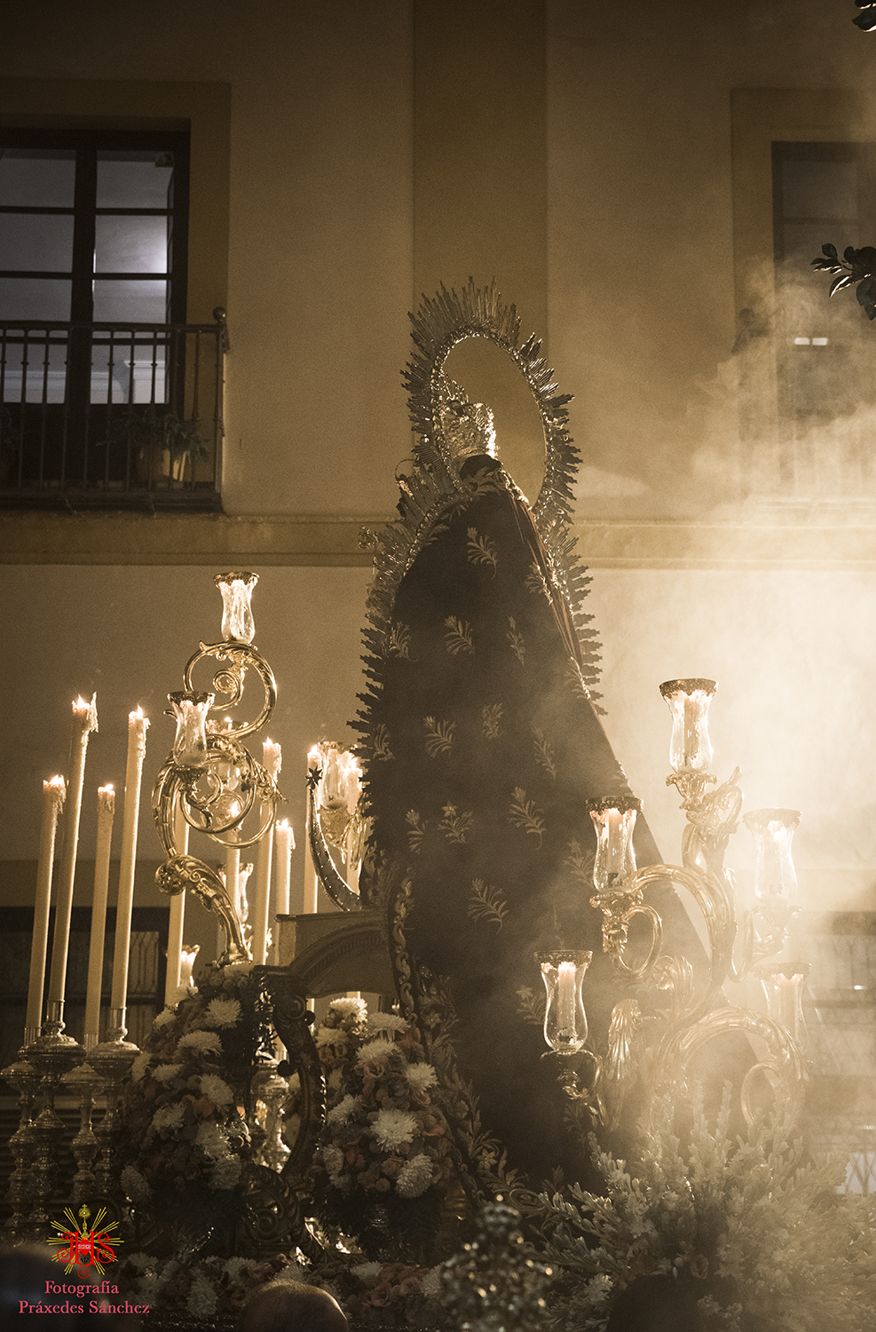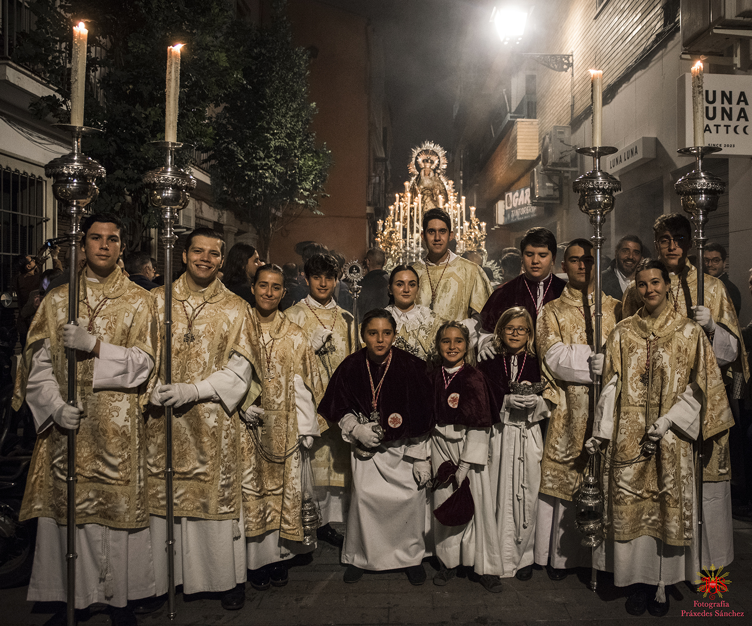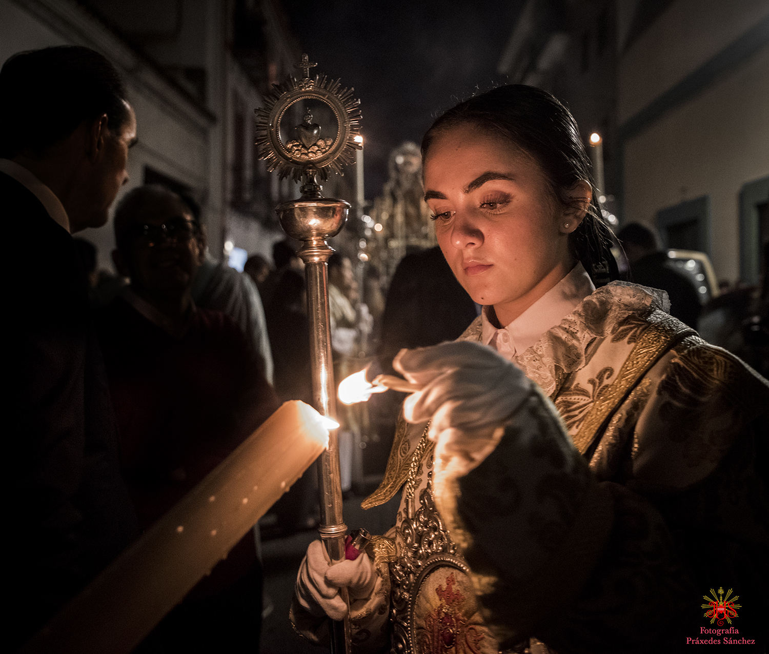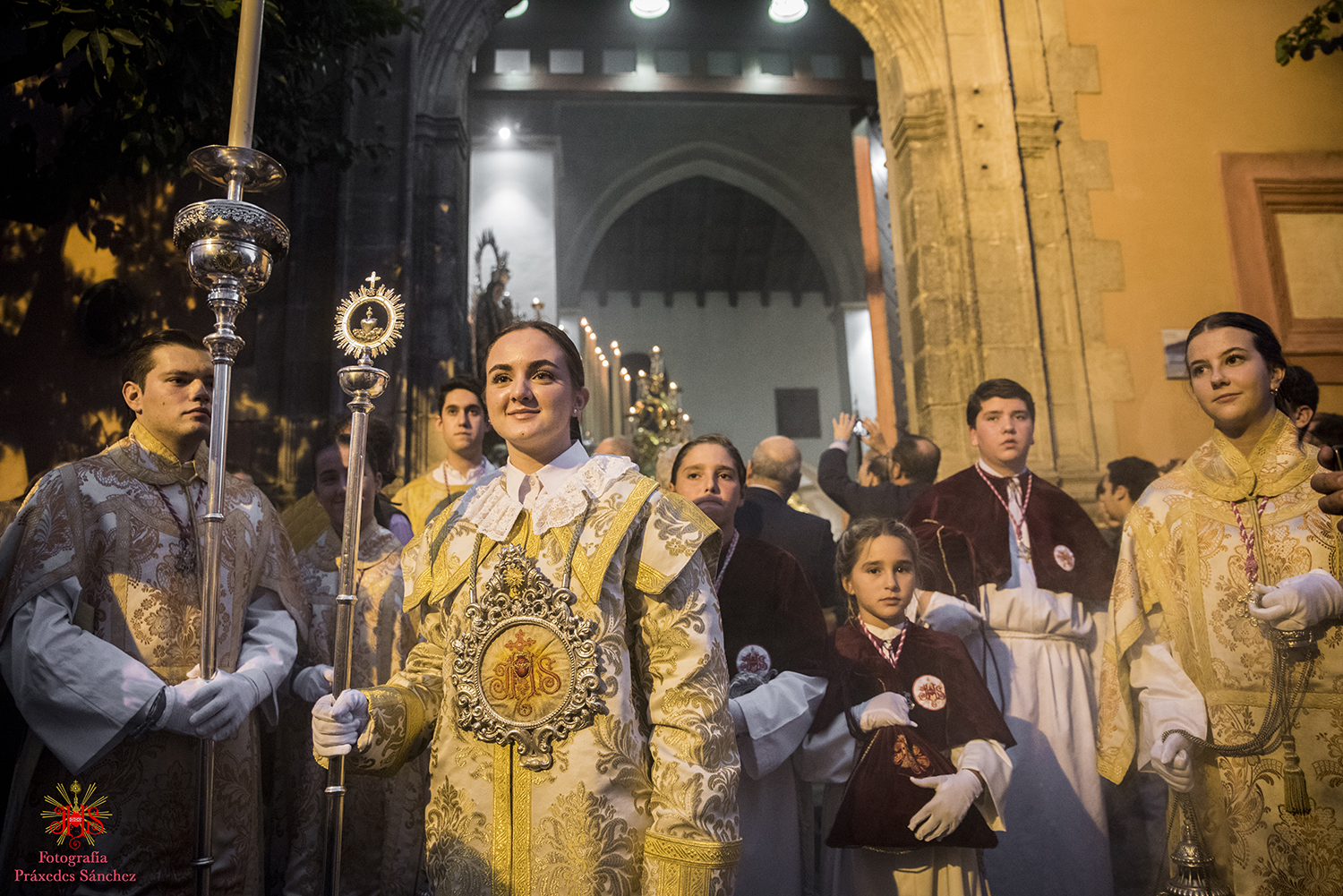 Sobre las 18.00 se abría la puerta de acceso a la parroquia para los hermanos que portaban cirios e ir conformando los dos tramos previstos, situándose a la entrada un cepillo para todos aquellos que quisieran colaborar con la bolsa de caridad de la hermandad y continuar nuestros proyectos dirigidos a mejorar la vida de aquellos quienes más lo necesitan. A las 18.30, precedido por los sones clásicos de las cornetas y tambores de nuestra querida banda Esencia, comenzó a salir el cortejo con cruz alzada y dos ciriales, continuado por más de treinta parejas de cirio, formando parte de él una representación de la querida Hermandad de Nuestra Señora de la Cabeza de San Juan de la Palma y en la presidencia tuvimos el placer de contar con la Hermandad de las Penas, así como del señor delegado de glorias del Consejo General de Hermandades y Cofradías, Manuel Martín Fajardo, nuestro párroco Carlos Coloma y por parte de la autoridad municipal la señora delegada y directora general del Distrito Centro, Amidea Navarro.