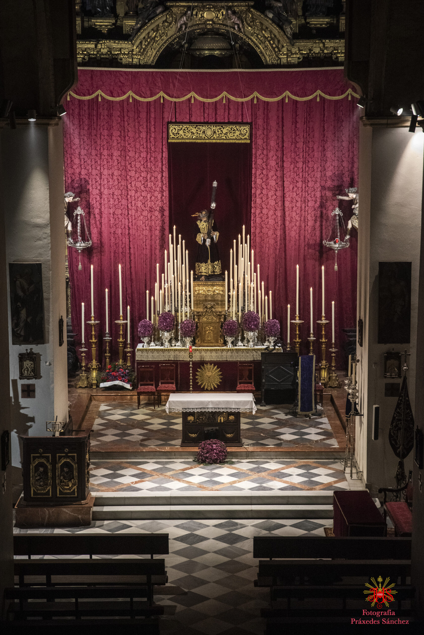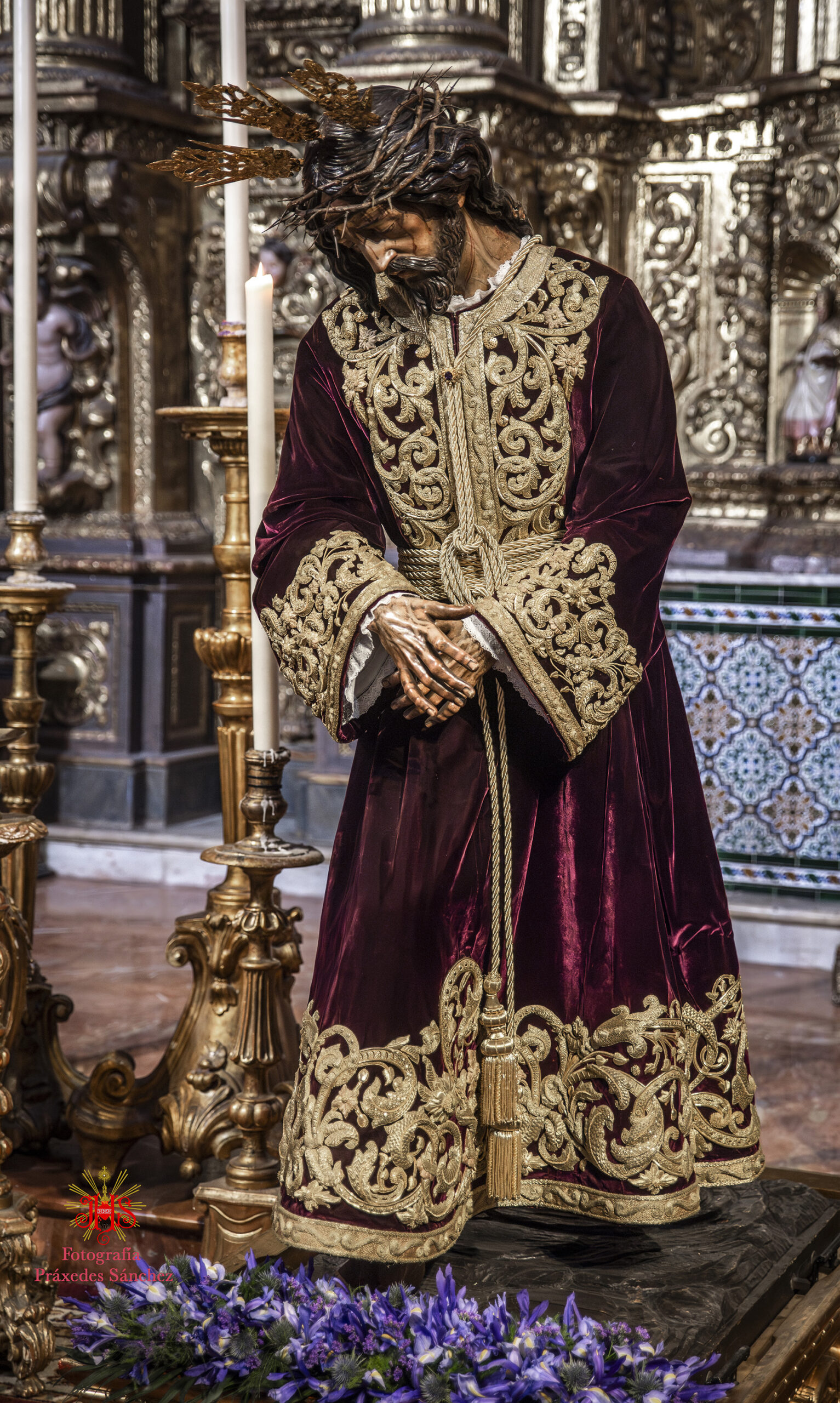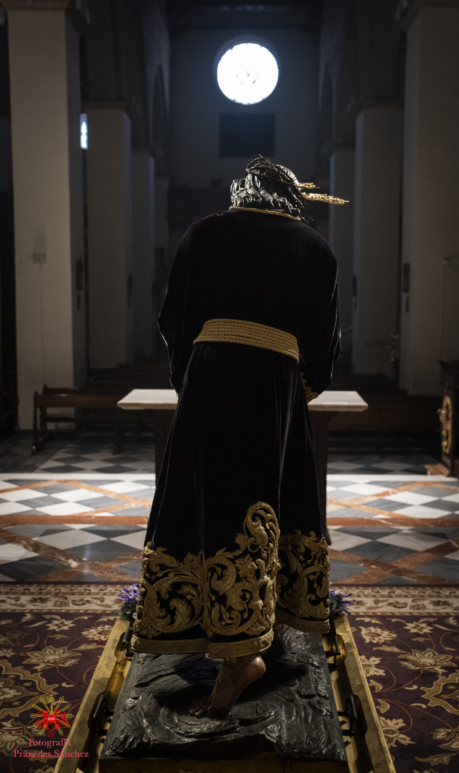 Con los pasos ya preparados para un nuevo Miércoles Santo, el Sábado de Pasión nuestra bendita imagen nos recibía en el altar mayor para la celebración de su solemne besamanos durante todo el día, el cual estaba engalanado con lirios y cardos.
