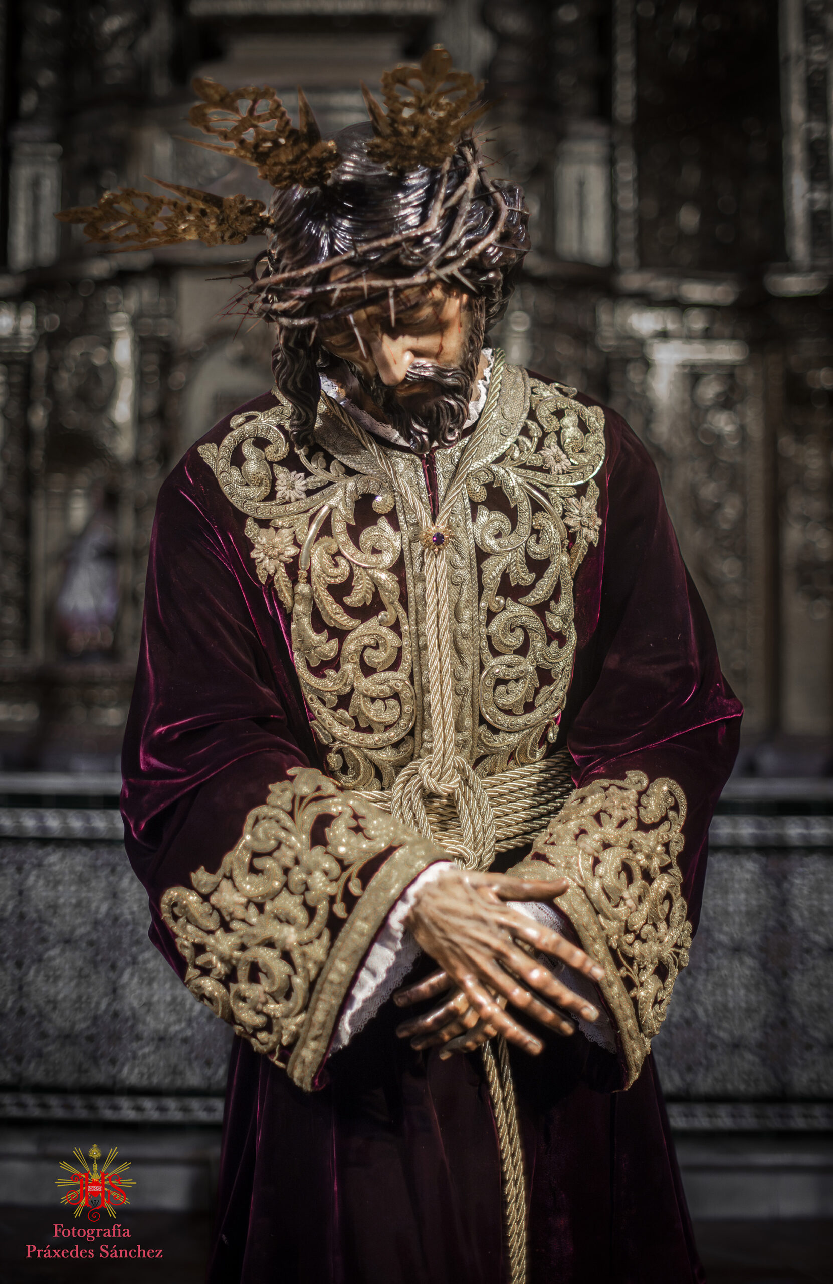 El Señor vestía la túnica diseñada y bordada en oro por los talleres de Fernández y Enríquez, portaba las potencias florlisadas y estrenaba un broche de plata bañada en oro con amatista y circonita realizado por la joyería el Toisón y donado por un grupo de hermanos.