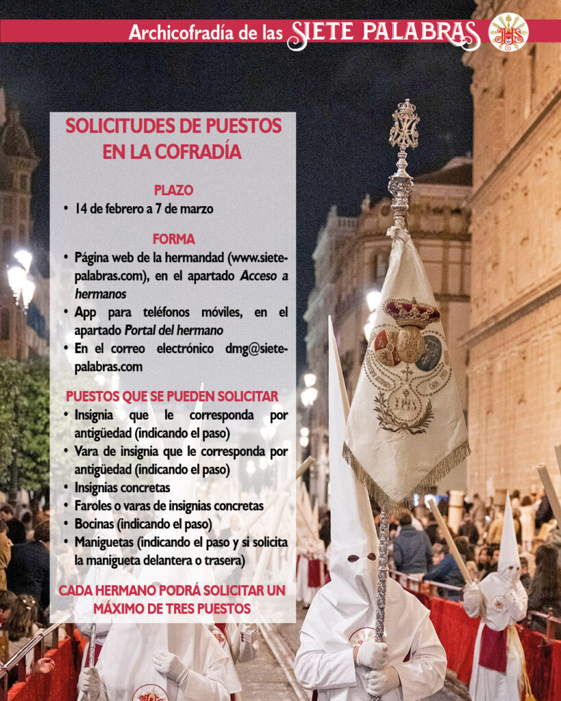 Con el objetivo de conformar de forma organizada el cortejo de cara al próximo Miércoles Santo, la junta de gobierno ha establecido como periodo para solicitar los puestos de la cofradía desde el 14 de febrero al 7 de marzo, pudiendo solicitar los siguientes cada hermano con un máximo de tres puestos, indicando el orden de preferencia: